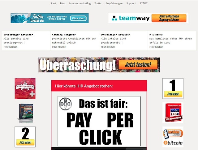 Zusätzlich habe ich einige externe eigene Werbeseiten, wo ich z.B. per Banner auch die Werbung für TeamWay anzeigen lassen kann und gleichzeitig Punkte für Traffic-Wave.de sammel, denn durch den speziellen Werbe-Code lasse ich einen Text-Werbe-Block auf dieser Seite vom Traffic-Wave.de-Portal einblenden und erhalte selbst dafür Punkte.
